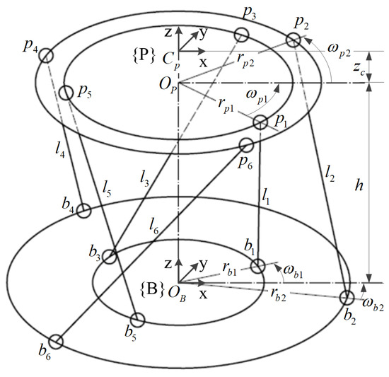 An RSSP comprises an MP for installing precise payloads, a base plate (BP), and six struts (each strut includes an actuator) connecting the two plates with six upper () and six lower () joints (Figure 1). For rotational symmetry [35], the struts were partitioned into two groups: the first group included struts 1, 3, and 5, and the second group contained struts 2, 4, and 6, which were obtained by rotating struts 1 and 2. Hence, the RSSP architecture can be described by the parameters of struts 1 and 2 as follows: