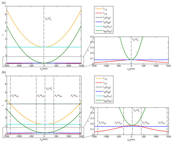 The eigenvalues of should be derived first to obtain the condition for keeping constant when moves. From the simplification of the transfer coefficient in Equations (21)–(23), the general form of can be obtained from the previous analysis as follows:
