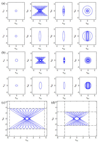 Equation (48) can be expanded by integrating Equation (26). To facilitate discussion, the projections of the hyper-ellipsoid on each 2-DOF plane are displayed in Figure 8a,b, when varies from −1500 mm to 1500 mm. The semi-major axis of each ellipse describes the maximum error in each diagram, and the maximum error occurs in TX-RY. As moves away from the decoupling center, the TX error intensifies because of the coupling between TX and RY. Comparing the TX-RY diagrams in Figure 8c,d, the maximum TX and RY errors of the ICN-RSSP are 69.80% and 66.85%, respectively, of the KI-RSSP. The hyper-ellipsoid analysis results demonstrate that the proposed method can reduce the transfer error amplification of the multi-DOF shaker and maintain this advantage in a larger space for the manipulation center, which is meaningful for multi-DOF shakers to improve motion accuracy and control performance [21].