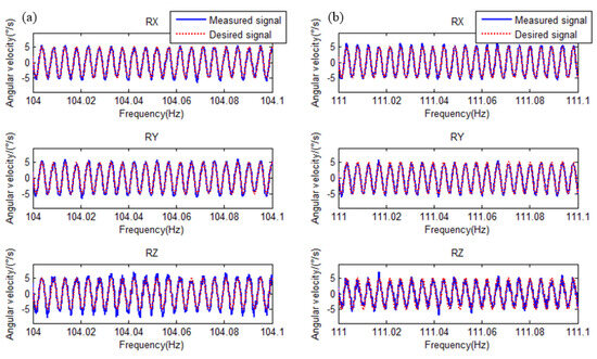 To evaluate the accuracy, the amplitude ratio and phase difference in the RX, RY, and RZ measured signals in the frequency domain of 5–200 Hz were calculated, and the results are shown in Figure 10. The left and right columns show the amplitude–frequency and phase–frequency curves, respectively. Here, the amplitude and phase errors are smaller than 10% and 10° in the frequency band, except for 104 Hz (111.63%, −2.55°) and 111 Hz (83.39%, −3.66°) in RZ, respectively, which were caused by the local vibration modes. The waveforms at 104 and 111 Hz are displayed in Figure 11a,b, where the blue lines and red dashed lines denote the measured signal and the desired signals, respectively. The real-time sweeping frequency was recorded along with time; thus, time can be replaced by frequency as the horizontal axis to directly exhibit the waveform at each frequency. The measured signal agreed well with the desired signal, although there were some amplitude errors and high-frequency noise. The results demonstrated the effectiveness of the method for obtaining a highly accurate multi-DOF shaker.