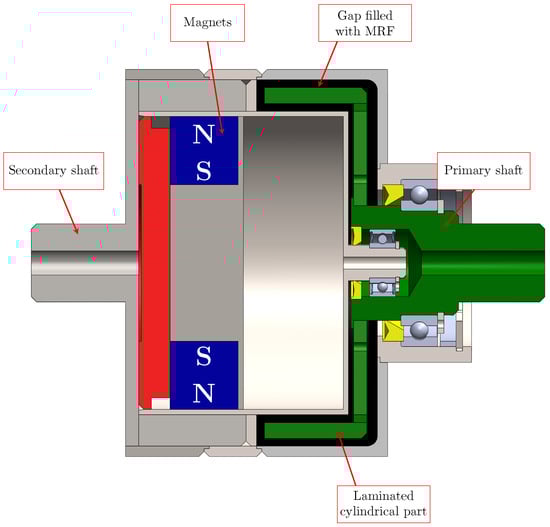 Figure 1 that comprises two shafts (the primary and secondary shaft, respectively), a double cup-shaped gap filled with MRF, and an excitation system consisting of PMs that moves axially and generates the magnetic field that excites the MRF. Two seals, positioned at low diameters, confine the fluid in the double cup-shaped area.