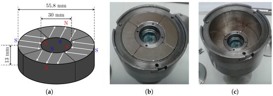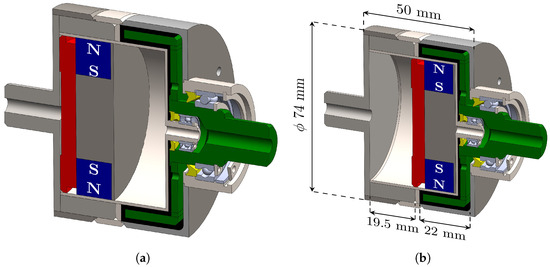 7] to disconnect the vacuum pump from the camshaft when the desired pressure is reached in the power-brake chambers. Then, the magnetorheological fluid-based clutch (MRF-based clutch) reconnects the vacuum pump to the camshaft when needed again. A system of permanent magnets has been used to suitably excite the MRF, allowing the device to satisfy some constraints in the system specifications (e.g., volume limits, ON/OFF torque ratio, fail-safe operation). In these papers, authors proposed several devices with various dimensions and designs, considering different magnetizations (radial and diametral) of the magnets, gap arrangements, and ferromagnetic structures. In particular, the authors have analyzed the device using network approaches equivalent to those described in [