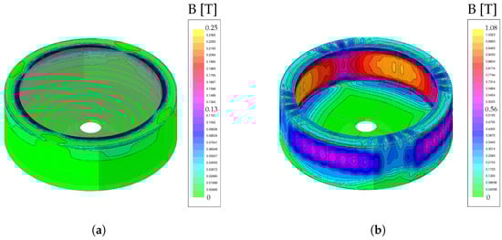 Figure 6 shows the magnetic flux density distribution within the gap filled with the MRF. Despite the teeth and slots influencing the magnetic flux density’s profile around the circumference, results indicate that this configuration effectively directs the magnetic flux lines across both the cylindrical parts of the MRF.