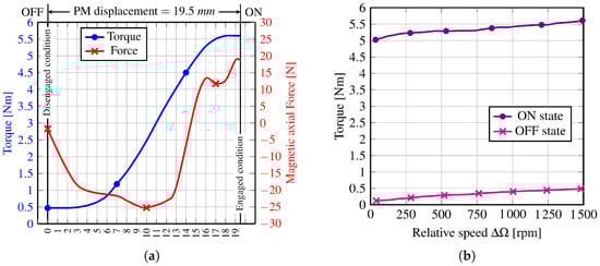 Figure 9a is the torque transmitted between the primary and secondary shafts with respect to the position of the PMs. The axial force, instead, is the attraction force between the PMs and the ferromagnetic materials that enclose them. This force either opposes or helps the PMs’ movement during the engagement/disengagement phases, so it has to be evaluated carefully.