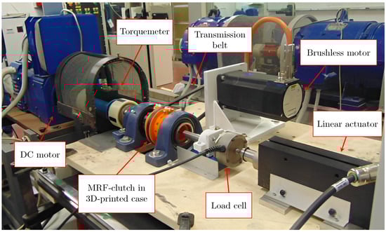 A custom test bench was necessary to experimentally test the MRF-clutch and address the challenges related to coupling rotating components with the linear motor measuring torque and speed. A suitable support was 3D printed to transmit the axial force required during the clutch engagement/disengagement phases, and the decoupling of the rotating and linear motions was ensured with a bearing. However, this solution did not allow to directly connect the clutch’s secondary shaft to a motor to simulate the camshaft. On the other hand, transmitting motion through a belt and pulley directly to the clutch shaft would have resulted in transverse loads that would overload the internal clutch bearing. Therefore, the 3D-printed case with a housing for the belt shown in