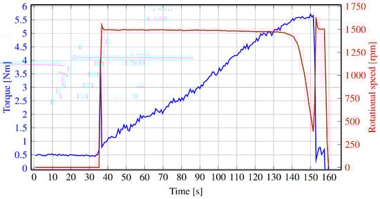 In particular, a first test was carried out to verify the maximum transmissible torque. Initially, the clutch was in the disengaged condition (OFF-state), with a null resistant torque applied by the DC motor and rotational speed of the primary shaft. The secondary shaft and the PMs excitation system were rotated at 1500 rpm with the brushless motor. Then, after about 35 s, the clutch was engaged (OFF- to ON-state), and once the primary shaft reached the same speed as the secondary one, the DC motor was controlled to increase (almost linearly) the resistant torque. At about 140 s, the torque reached the maximum value transmissible by the clutch (about 5.5 Nm), and the primary shaft abruptly decreased its speed. At this point, the DC motor reduced the resistant torque, reaching a value near 0.5 Nm. The rotational speed of the primary shaft grew again, reaching the speed of the secondary one until the system was turned off (at about 160 s).