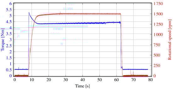 Figure 14 reports the measurements performed during this test. In particular, the transmitted torque is depicted in blue and the rotational speed of the primary shaft is in red.