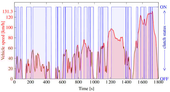 s. In particular, the profile of the WLTC vehicle speed is depicted in black, and crosses (×) are placed in correspondence with braking events. As described in the Introduction section, the MRF clutch activation procedure expects that each braking event engages the clutch for 20 s. If a second braking event occurs during this period, the clutch does not change its status, but another time range of 20 s is added at the end of the previous interval unless an acceleration phase occurs before the ending of the preceding 20 s.