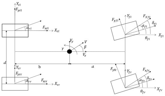 This study involves the equivalent transformation of the three-axle vehicle model into a simplified two-axle vehicle model. As shown in Figure 1, is the wheel angle. can be or , representing the left or right wheel. can be or , representing front or rear axle. and are the longitudinal and lateral forces of the wheels. and are the longitudinal and lateral component forces of the wheel.