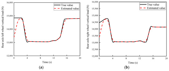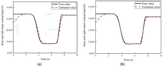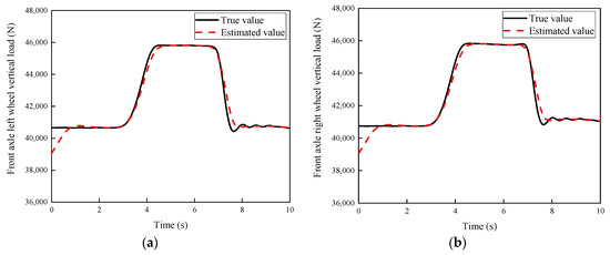The road adhesion coefficient is 0.85. The vehicle is in a fully loaded state. The vehicle is operated at a constant velocity prior to the initiation of the braking procedure. It can be seen in Figure 3 and Figure 4. The initial values of the vehicle load estimation algorithm are preset as 39,057 N for the front axle and 13,312 N for the rear axle. At 0 s, there is an error between the estimated vehicle load and the actual value. At around 0 to 1.12 s, the estimated vehicle load converges to the true value. At the onset of braking at 3 s, the vehicle experiences forward movement of its center of mass, leading to an increase in the load on the front axle and a decrease in the load on the rear axle.