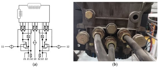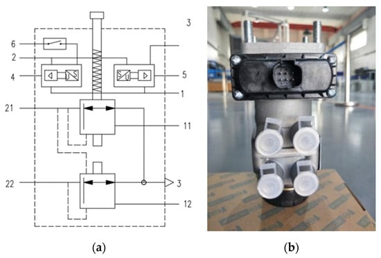 As shown in Figure 10, in the pneumatic circuit of the single-channel bridge control module: Port 1 is the air inlet and is connected to the air storage cylinder. Port 2 signifies air outlets connected to the ABS solenoid valve. Port 3 corresponds to the exhaust ports, which are effectively vented to the surrounding atmosphere. Port 4 serves as the control port, responsible for regulating the valve’s operation. In the event of an electronic control circuit malfunction, the valve seamlessly transitions to pneumatic control, ensuring its continued functionality.