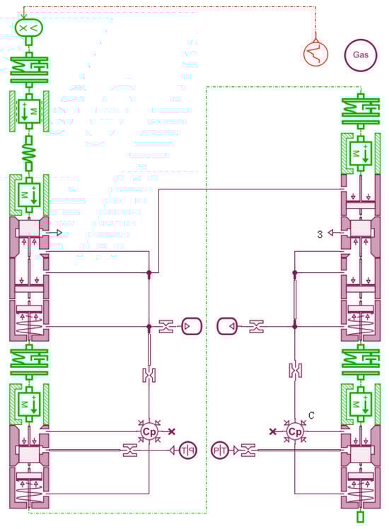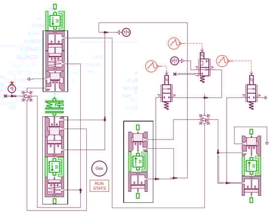Model of single-channel bridge control module. The red “x” represents a plug, Green represents mechanical components, Light purple represents pneumatic components.