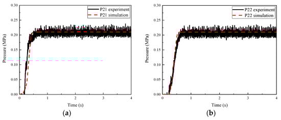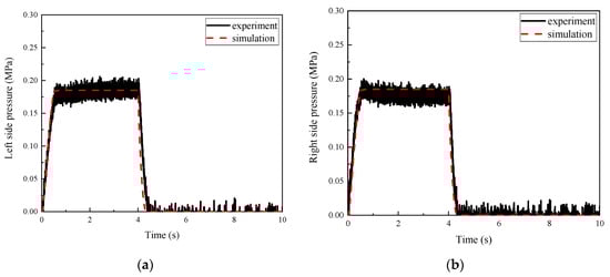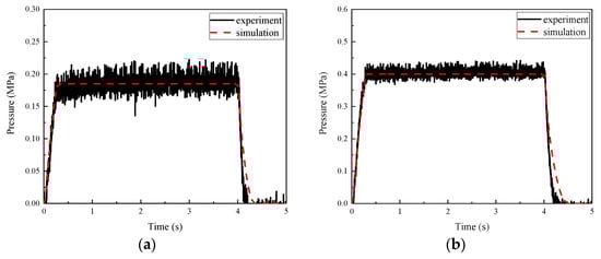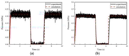 The response of output pressure with time is shown in Figure 12 for when the gas source pressure is 0.2 MPa and 0.4 MPa, respectively. The visual representation in Figure 11 reveals a noteworthy correspondence between the experimental data of the valve and the simulation data obtained. This alignment substantiates the capability of the model in accurately capturing the dynamic response of the valve when subjected to the specified operational conditions.
