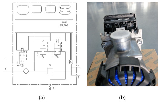 In Figure 10, the working principle diagram and physical diagram of the single-channel bridge control module are shown, respectively. During typical vehicle operation, the single-channel bridge control module receives signals from the central electronic control unit (ECU) and regulates the output port pressure by means of the internal boost valve and pressure-reducing valve, aiming to achieve the desired pressure value. When the electronic control fails, the backup valve is used to enable the vehicle to brake normally and improve driving safety.