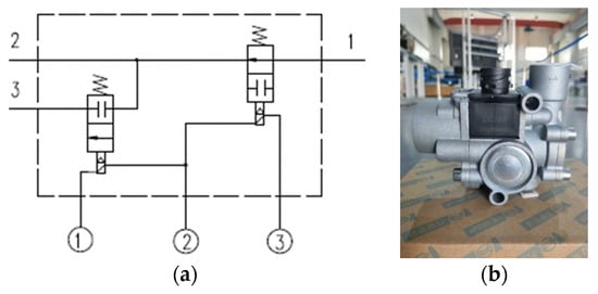 (a) Working principle diagram of ABS solenoid valve, Port 1 is the air inlet, Port 2 is the air outlet, Port 3 is the exhaust port, ② + ③ is the pressure retaining coil, ② + ① is the pressure reducing coil; (b) physical image of ABS solenoid valve.