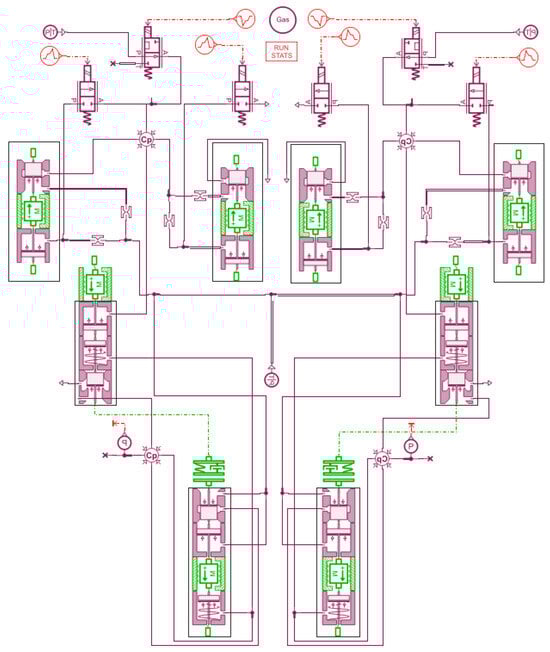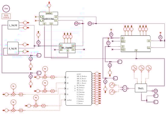 EBS dynamic model and interface settings. Light purple represents pneumatic components, Red represents electrical components, Ports 11 and 12 are air intakes, Ports 21 and 22 are air outlets, Port 4 is a communication port, Ports R21, R22, 6_ 4 and 6_ 5 is the exhaust port, Port pedal is the brake pedal, Port L1 represents the left side of the first axis, Port R1 represents the right side of the first shaft, Port L2 represents the left side of the second axis, Port R2 represents the right side of the second axis, Port oneOut represents the output port, Port ABS_ R_ Reduce represents the pressure reduction of the right ABS valve, Port ABS_ R_ Boost represents the right ABS valve boost, Port ABS_ L_ Reduce represents the pressure reduction of the left ABS valve, Port ABS_ L_ Boost represents the left ABS valve boost, Port R2_ Backup represents the backup valve on the right side of the second shaft, Port R2_ Reduce represents the pressure reducing valve on the right side of the second shaft, Port R2_ Boost represents the boost valve on the right side of the second shaft, Port L2_ Backup represents the backup valve on the left side of the second shaft, Port L2_ Reduce represents the pressure reducing valve on the left side of the second shaft, Port L2_ Boost represents the left boost valve of the second shaft, Port F_ Backup represents the front axle backup valve, Port F_ Reduce represents the front axle pressure reducing valve, Port F_ Boost represents the front axle boost valve, The “x” represents a plug.