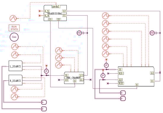 In terms of interface settings, the EBS dynamics model mainly receives the target pressure from the EBS valve control algorithm and outputs the actual pressure to the vehicle dynamics model. Figure 22 showcases the interface configurations for the dynamic model of the electronic braking system (EBS) and the collaborative simulation.