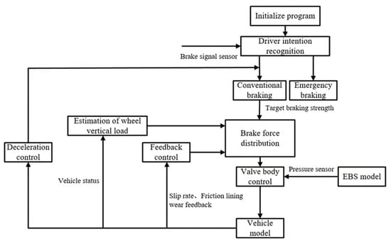 This study mainly focuses on the research of commercial vehicle EBS control algorithms during the conventional braking process, including vertical load estimation, driver intention recognition, brake force distribution control, deceleration control, and valve control algorithms. The process is shown in Figure 20.