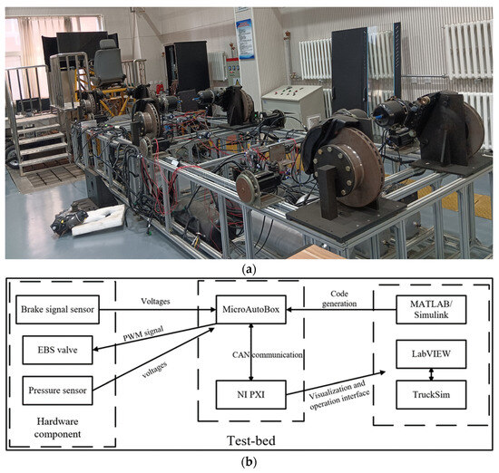 (a) The physical image of the hardware in the loop test bench; (b) Overall architecture of EBS hardware-in-the-loop experimental platform.