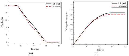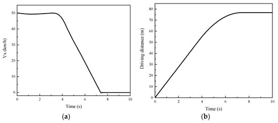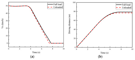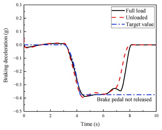 When the vehicle was fully loaded and unloaded, with an initial speed of 50 km/h and an adhesion coefficient of 0.85, the pedal opening gradually changed from 0 to 50%. The test results are shown in Figure 32 and Figure 33. As shown in Figure 32, the vehicle started braking at 3 s, and the braking deceleration of the vehicle was basically equal to the target braking deceleration. At 7.3 s, the vehicle speed decreased to 0. At this point, the pedal had not yet been released, so the target braking deceleration remained unchanged, but the actual braking deceleration became 0. The simulation results demonstrate that at a throttle aperture of 50%, the vehicle exhibited uniform braking deceleration across diverse load conditions.