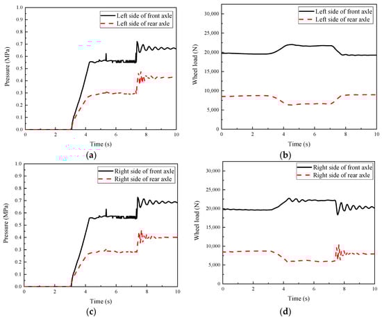 (a) Left-brake-chamber pressure of front and rear axles; (b) vertical load of left wheel on front and rear axles; (c) right-brake-chamber pressure of front and rear axles; (d) vertical load of right wheel on front and rear axles.