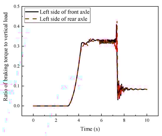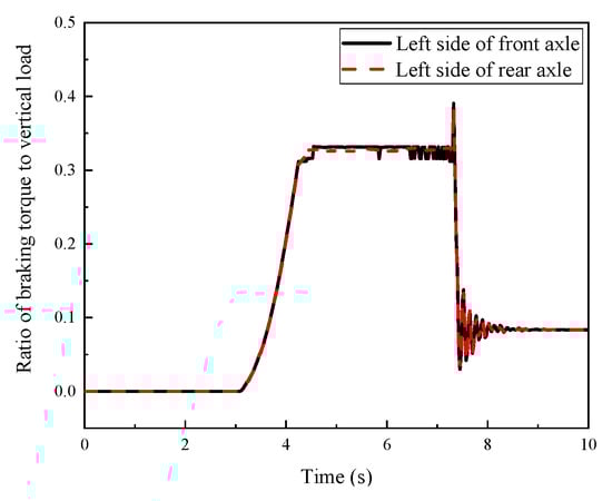 When the vehicle was operating without any load, starting at an initial velocity of 50 km/h and an adhesion coefficient of 0.85, the throttle aperture gradually transitioned from 0% to 50%. The test results are shown in Figure 24, Figure 25 and Figure 26. As shown in Figure 24, in the initial stage, the speed could not be kept constant. At 3 s, the vehicle began to brake, and there was a certain delay in establishing pressure in the wheel brake chamber. At 7.3 s, the vehicle speed decreased to 0. Due to the fact that the target braking strength is only related to the pedal opening and the pedal had not yet been released, the difference between the target braking strength and the actual braking strength was too large. Therefore, the brake pressure of the front and rear wheels continued to increase, and its maximum value was related to the vertical load of the wheels. As depicted in Figure 25, following the initiation of braking, the displacement of the vehicle’s center of mass resulted in an augmentation of the front-axle load while concurrently diminishing the rear-axle load. After the vehicle speed decreased to 0, the front- and rear-axle loads of the vehicle returned to the state before braking. As shown in Figure 26, the ratio of the braking torque of the front- and rear-axle wheels of the vehicle to the vertical load was equal, indicating that the braking torque of the front and rear wheels of the vehicle dynamically changed with the vertical load.