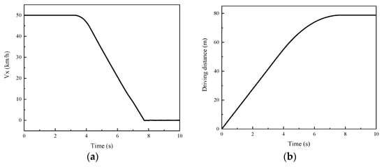 In the scenario where the vehicle was under maximum load capacity, commencing at an initial velocity of 50 km/h and an adhesion coefficient of 0.85, the throttle aperture steadily transitioned from 0% to 50%. The test results are shown in Figure 27, Figure 28 and Figure 29. As shown in Figure 27, at 3 s, the vehicle began to brake, and there was a certain delay in establishing pressure in the wheel brake chamber. At 7.4 s, the vehicle speed decreased to 0. Although there was a significant difference between the target braking strength and the actual braking strength at this time, due to the large vertical load on the wheels, the front wheel braking pressure reached its maximum, and the rear wheel braking pressure continued to increase and reach its maximum. As shown in Figure 28, after the vehicle braked, due to the forward movement of the center of mass, the front-axle load of the vehicle increased and the rear-axle load decreased. After the vehicle speed decreased to 0, the front- and rear-axle loads of the vehicle returned to the state before braking. As shown in Figure 29, the ratio of the braking torque of the front- and rear-axle wheels of the vehicle to the vertical load was equal, indicating that the braking torque of the front and rear wheels of the vehicle dynamically changed with the vertical load.