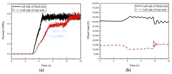 (a) Left-brake-chamber pressure of front and rear axles; (b) vertical load of left wheel on front and rear axles.