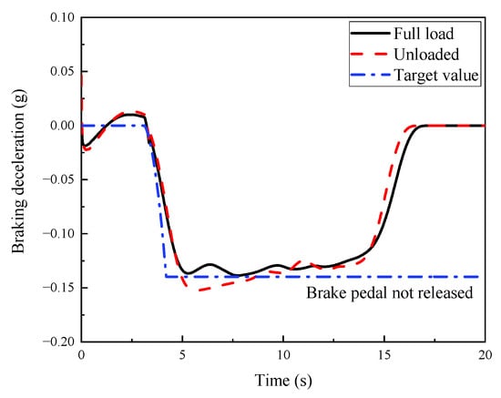 When the vehicle was fully loaded and unloaded, with an initial speed of 50 km/h and an adhesion coefficient of 0.85, the pedal opening gradually changed from 0 to 30%. The test results are shown in Figure 30 and Figure 31. As shown in Figure 30, in the initial stage, the speed could not be kept constant. The vehicle started braking at 3 s, and the braking deceleration of the vehicle was basically equal to the target braking deceleration. At 15 s, the vehicle speed decreased to 0. At this point, the pedal had not yet been released, so the target braking deceleration remained unchanged, but the actual braking deceleration became 0. The simulation findings indicate that when the throttle aperture reached 30%, the vehicle demonstrated consistent braking deceleration across varying loads.