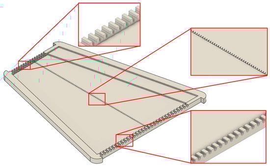 The mold has multiple slots to fix the crimped SMA in place before embedding it in silicone. The slots are 2.5 mm in diameter and are centered 2.5 mm from the top surface of the mold. The silicone curing area of the mold is 3 mm thick, and the sides are equal to the circumference of the diameters of the arm. The smaller base of the trapezium is 60 mm long, while the larger base is 160 mm long. A lip of 20 mm is added at the side of the trapezium to seal the 2D sheet into a 3D truncated cone.
