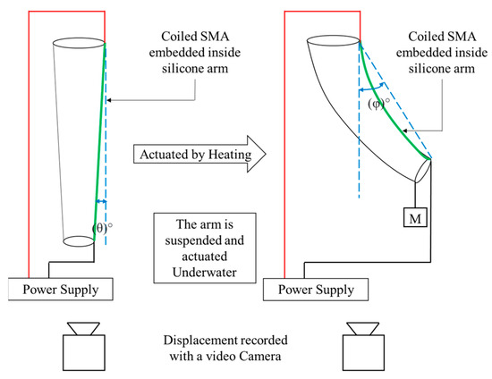 The silicone arm is suspended in a tank underwater such that the SMA is exactly on the side of the arm, as shown in the schematic in Figure 3. The value of M for studying the bending characteristics is 0 g, as no weight is attached to the tip of the arm. The SMA embedded inside the arm is actuated with all combinations of 1.125 A–1.5 A with an interval of 0.125 A and heating times of 2 s–5 s with an interval of 1 s and the cooling time of 45 s underwater. All the actuation cycles were captured in a video recording.