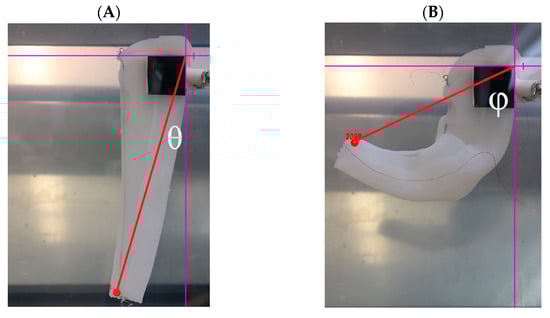 The placement of the origin of the cartesian coordinate system and the demonstration of the bending angle calculations. (A) Nondisplaced arm position. (B) At a fully actuated position.