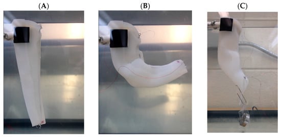 Some bending configurations of the silicone arm. (A) Nondisplaced arm. (B) Fully curled arm with no weight attached at the tip. (C) Fully displaced arm lifting 50 g.