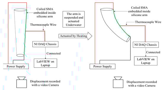The coiled SMA embedded silicone arm is suspended underwater with the help of a lab stand. The J-type thermocouple wire which is connected to a NI-cDAQ 6178 chassis is inserted in the silicone and wound on the SMA coil in the geometrical center to obtain the temperature readings that are not affected by the extremities. The NI-cDAQ 6178 chassis reads the temperature of the coil with the help of LabVIEW. The frequency of the data acquisition is 10 Hz (explained in Figure 6). A simplistic analytical temperature model of the arm is developed to predict the temperature of the SMA coil. One can say from the first law of thermodynamics using Equation (1),