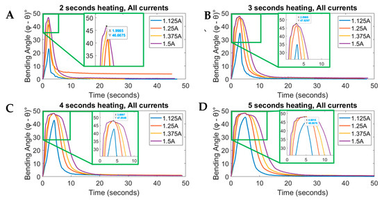 Figure 7A–D show the bending angle of the tip of the arm vs. time for the currents used. As expected, a higher bending angle is caused by actuating the SMA with a higher current and a corresponding higher heating time. However, as can be seen in Figure 7B, the bending angle peaks at a minimum current of 1.25 A and a corresponding minimum time of 3 s. The maximum bending angle achieved is about 48°, as can be seen in Figure 7. This peak angle can be set as the limit of the silicone arm above which the arm is not able to bend.