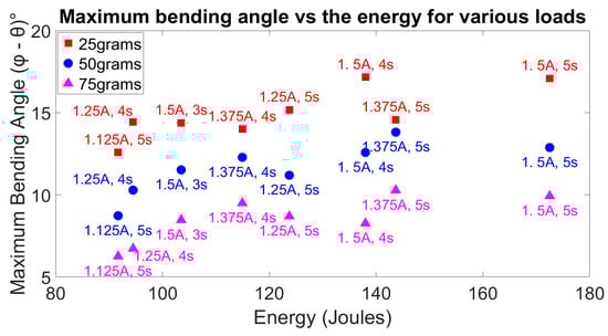 It can be seen from the figure above that for low actuation current and low time, the bending angle of the tip of the arm does not reach its maximum potential. For a relatively lower load of 25 g on the arm, the maximum bending angle reaches 12.5°, whereas for a higher load of 75 g, the single-coil SMA arm can reach a maximum bending angle of 6° only. For all the loads and the current and time combinations, the bending angle peaks at around 130 J–140 J of electrical energy. At around 140 J, a maximum bending angle is achieved. This peak angle is around 17° for 25 g, 13° for 50 g, and about 10° for 75 g, as can be seen in Table 2. If a higher energy is supplied, by either increasing the current and/or the heating time of actuation, the bending angle saturates. However, the desired curling shape is achieved much faster than the curling shape with lower current and time combinations. The energy used is a trade-off between the frequency of actuation and the energy consumed during the experiment. If little to no energy is to be wasted in increasing the temperature of the coil excessively, then one has to trade off the faster frequency. However, if the arm is to be used in an application that requires higher frequency, then high energy can be supplied, and as a result, the measurable qualities such as efficiency and the overall life of the SMA are compensated.