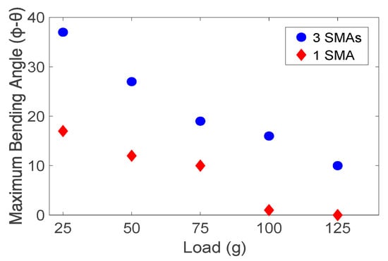 Maximum bending angle vs. energy consumed by the SMA for various loads.