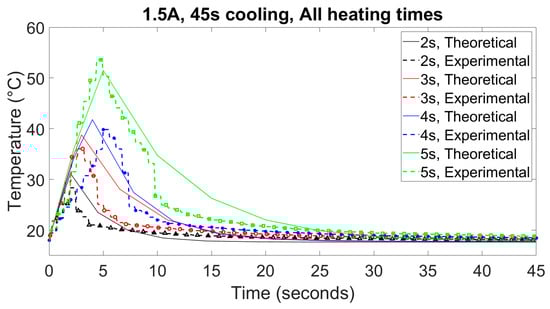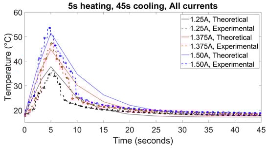 Two types of temperature modeling results are shown in Figure 10 and Figure 11, respectively. In Figure 10, the created model demonstrates the comparison between the experimental temperature and the analytical temperature obtained from the model presented in Equation (2) for an actuation current of 1.5 A for 2, 3, 4, and 5 s. In this test, the heating time is changed, which results in the change of the duty cycle, which is one of the crucial variables in the whole model. The other type of model demonstrates the comparison between the experimental temperature and the analytical temperature obtained from the model for a heating time of 5 s and a cooling time of 45 s for 1.25 A, 1.375 A, and 1.5 A of actuation current. In this type of model, the current is changed, which results in the change of voltage and the expression for h only.