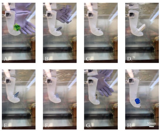 Using the created arm, various objects with different sizes and weights were allowed to be grasped by the arm underwater. In these experiments, multiple SMAs were actuated. Figure 11 shows the various objects that the arm was able to lift underwater. It must be noted that the objects had to be held in place for a brief period while the actuation was activated for the arm to be able to hold them. In all the cases shown, the arm was actuated with 2.75 A (total current) for 5 s. The soft material can facilitate delicate grasping without damaging or deforming the structure, as seen in examples of a plant stem and flexible elastomer tubing shown in Figure 12A,F. The soft material of the arm can conform around the body of the object, making it easy to hold on to thicker objects such as a 3D-printed gear and plate in Figure 12B and 12D, respectively, all the way down to thin objects such as a thin ruler shown in Figure 12E. Finally, the use of multiple SMAs increases the weightlifting capability; Figure 12A–H show ascending order by weight of object held starting from 2 g up to 50 g. We can conclude that increasing the number of embedded muscles will further increase the weightlifting capabilities.