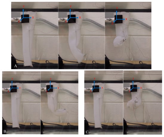 Snapshots of shape manipulation utilizing sequential actuation. (A) Activating 3 SMAs. (B) 2 SMAs (long middle and the one towards positive Z). (C) 2 SMAs (long middle and the one towards negative Z).
