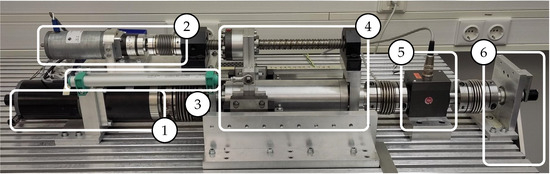 Picture of the VTS actuator with (1) DC motor with a gearbox (Actuation Unit 1), connected to the torsional rod via a coupling; (2) DC motor with gearbox (Actuation Unit 2), connected to torsional rod mechanism via a coupling; (3) Linear potentiometer measuring ; (4) Torsional rod with a mechanism to change its length ; (5) Torque sensor measuring ; (6) Lever for user interaction.
