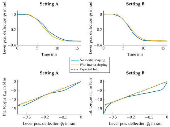 Interaction step responses. Deflection of from a fixed lever position. Setting A: , ; Setting B: , . Tests show that the expected interaction behavior, i.e., , is obtained when implementing inertia shaping. Without it, unmodeled static friction components are noticeable and deform the interaction curve vs. .