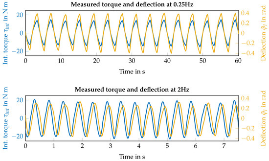 Periodic interaction examples with setting A: , . The periodic interaction signals are obtained by deflecting the position of the lever following a visual and auditory metronome. The plots show 15 cycles of measured torque and deflection measurements.