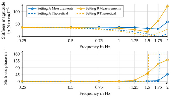 Measured and theoretical Bode magnitude plot (top) and phase plot (bottom) of stiffness transfer function . Setting A: , , Setting B: , . Natural frequencies of measured response match.