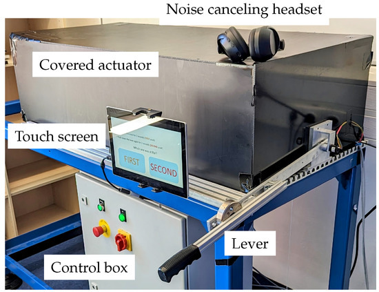 During experiments, the actuator was fully covered using black Plexiglass plates to avoid participants being able to see moving parts. Additionally, participants were asked to wear a noise canceling headset to minimize the influence of sounds of the actuator. The experimental setup is shown in Figure 7.