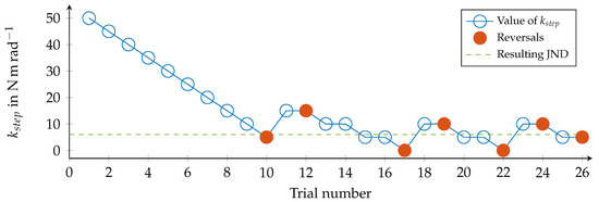 A convergence of against the JND of stiffness was assumed to be achieved after 7 reversals, where a reversal is a change from an increasing to a decreasing stiffness or vice versa. Alternatively, an experiment was stopped after 40 trials to avoid taking too much time per experiment. The JND of stiffness was calculated as the average value of of the last 10 trials. One example run of an experiment is displayed in Figure 8.