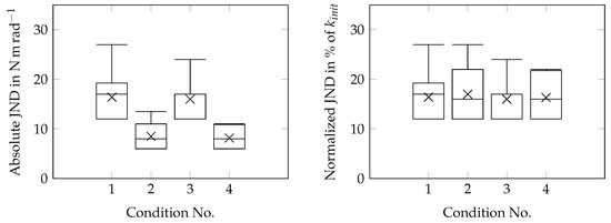 To compare the obtained JND, the results are given both in their absolute quantity, measured in , and its normalized quantity, described as a percentage of the initial stiffness . Measurements of the stiffness JND for all conditions are presented in Table 3. Figure 9 shows the boxplot of the normalized JND.