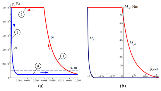 The pressure acting on the piston is assumed to be pre-set and is represented by the pressure-displacement indicator diagram shown in Figure 2a [32], where the following positions are used to denote the parts of the diagram: 1—compression, 2—discharge, 3—expansion, and 4—suction. The red line represents the motion of the piston from TDC to BDC, whereas the blue line represents the motion from BDC to TDC. The moment Mp generated by the indicating pressure force at the revolute joint O of the three-arm rocker is computed using Equation (14) and is depicted in Figure 2b.