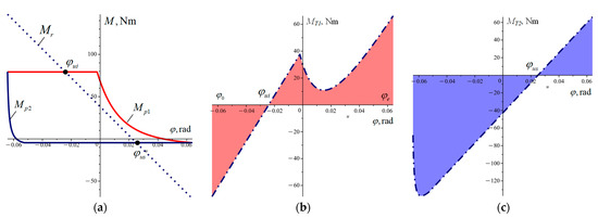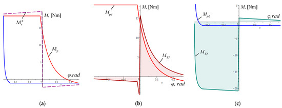 In Figure 4a, the negative recuperative moment is depicted using a dashed line, while the indicator diagram is represented by a solid line. In Figure 4b,c, the changes of the piston moments , and total moments , are shown. The presence of a jump discontinuity in the middle of the two strokes facilitates the alignment of the two instability positions φui and φus. This approach successfully addresses the challenges mentioned earlier by minimizing the stretching of the SMA wires and utilizing springs with low stiffness and low loading forces.