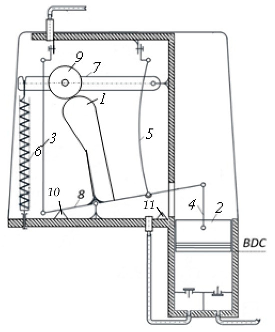 Scheme of a pump with a recuperative cam mechanism: 1. Cam; 2. Piston; 3. Discharge SMA wire; 4. Coupler; 5. Suction SMA wire; 6. Recuperative spring; 7. Oscillating follower; 8. Three-arm rocker; 9. Roller; 10. Left end stop; 11. Right end stop.